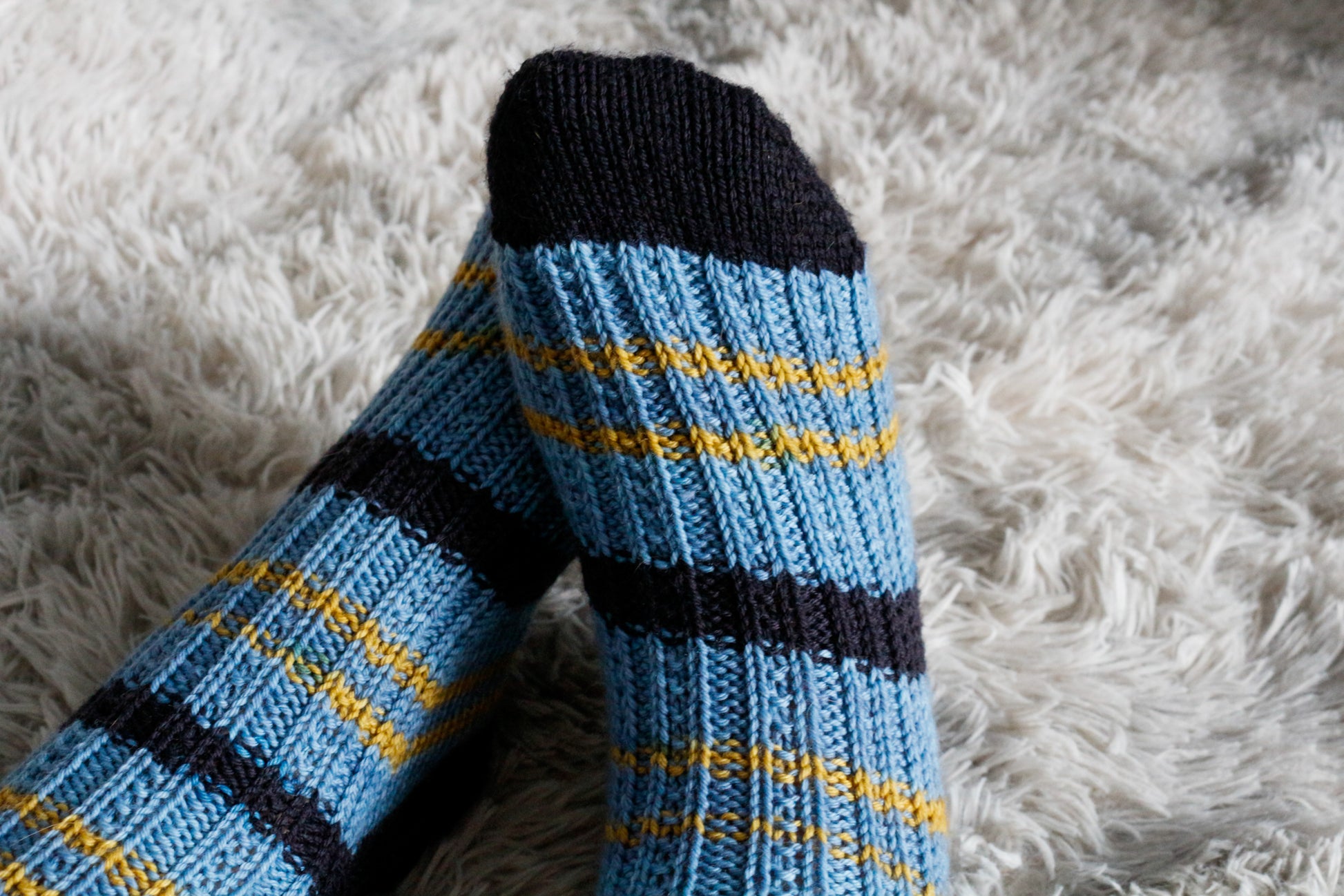 6 (6.5, 7, 7.75, 8.25, 9, 9.5, 10, 10.75, 11.25)” / 15 (16.5, 18, 19.5, 21, 22.5, 24, 25.5, 27, 28.5) cm circumference — select a size from the finished measurements that is 1-1.5” / 2.5-4 cm smaller than your foot circumference. These socks are worn with negative ease. We made the sample pair from the toe-up directions in Size 5.